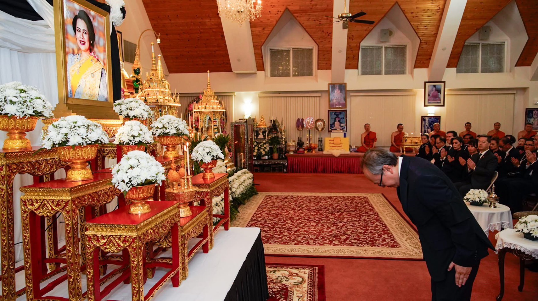 วันที่ 27 ตุลาคม 2568 สถานเอกอัครราชทูต ณ กรุงวอชิงตัน ร่วมกับพสกนิกรชาวไทยในสหรัฐอเมริกา จัดพิธีบำเพ็ญกุศลสวดพระอภิธรรม เพื่ออุทิศถวายพระราชกุศลแด่ สมเด็จพระนางเจ้าสิริกิติ์ พระบรมราชินีนาถ พระบรมราชชนนีพันปีหลวง ณ วัดไทยกรุงวอชิงตัน ดี.ซี. พิธีดังกล่าวได้รับเกียรติจาก ดร. สุริยา จินดาวงษ์ เอกอัครราชทูต ณ กรุงวอชิงตัน เป็นประธานในพิธี โดยมีหัวหน้าสำนักงานทีมประเทศไทย ข้าราชการ เจ้าหน้าที่สถานเอกอัครราชทูตฯ และครอบครัว รวมทั้งพสกนิกรชาวไทยและชาวไทย–อเมริกันในพื้นที่ เข้าร่วมพิธีกว่า 150 คน ในโอกาสนี้ นายฌอน โอนีล (Sean O’Neill) ผู้ได้รับการแต่งตั้งให้ดำรงตำแหน่งเอกอัครราชทูตสหรัฐอเมริกาประจำประเทศไทยคนใหม่ และ นายเบร็ต แบล็กชอว์ (Brett Blackshaw) ตำแหน่ง Senior Advisor, Bureau of East Asian and Pacific Affairs กระทรวงการต่างประเทศสหรัฐฯ พร้อมด้วยคู่สมรส ได้ให้เกียรติเข้าร่วมในพิธีดังกล่าวด้วย ทั้งนี้ วัดไทยกรุงวอชิงตัน ดี.ซี. กำหนดจัดพิธีบำเพ็ญกุศลสวดพระอภิธรรมเพื่ออุทิศถวายพระราชกุศลแด่ สมเด็จพระนางเจ้าสิริกิติ์ พระบรมราชินีนาถ พระบรมราชชนนีพันปีหลวง ตั้งแต่วันจันทร์ที่ 27 ตุลาคม – วันอาทิตย์ที่ 27 พฤศจิกายน พุทธศักราช 2568 เวลา 19.00 น.