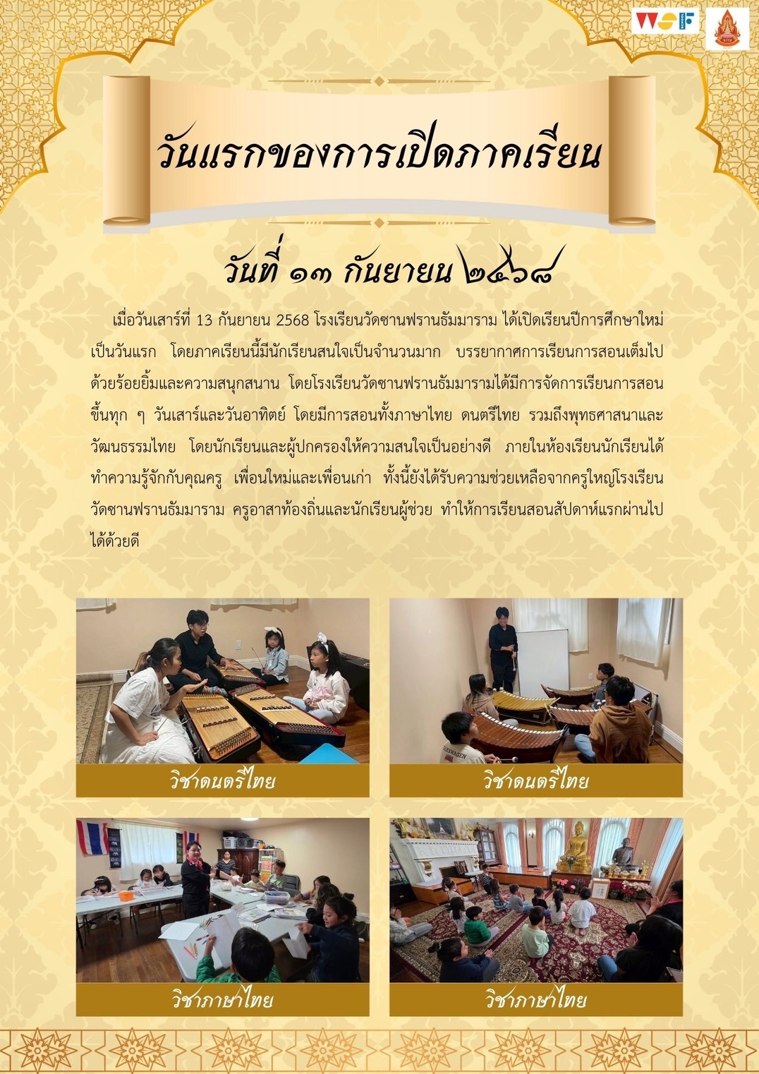 วันเสาร์ที่ 13 กันยายน 2568 โรงเรียนวัดซานฟรานธัมมาราม ได้เปิดเรียนปีการศึกษาใหม่เป็นวันแรก โดยภาคเรียนนี้มีนักเรียนสนใจเป็นจำนวนมาก บรรยากาศการเรียนการสอนเต็มไปด้วยร้อยยิ้มและความสนุกสนาน โดยโรงเรียนวัดซานฟรานธัมมารามได้มีการจัดการเรียนการสอนขึ้นทุก ๆ วันเสาร์และวันอาทิตย์ โดยมีการสอนทั้งภาษาไทย ดนตรีไทย รวมถึงพุทธศาสนาและวัฒนธรรมไทย โดยนักเรียนและผู้ปกครองให้ความสนใจเป็นอย่างดี ภายในห้องเรียนนักเรียนได้ทำความรู้จักกับคุณครู เพื่อนใหม่และเพื่อนเก่า ทั้งนี้ยังได้รับความช่วยเหลือจากครูใหญ่โรงเรียนวัดซานฟรานธัมมาราม ครูอาสาท้องถิ่นและนักเรียนผู้ช่วย ทำให้การเรียนสอนสัปดาห์แรกผ่านไปได้ด้วยดี